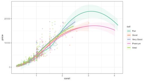 geom_point( )で散布図を描く geom_smooth( )で回帰直線・曲線を描く geom_rug( )で周辺ラグプロットを描く おわりに 参考資料 ggplot2パッケージ(tidyverseパッケージに含まれている)のdiamondsデータを使う。 > library(tidyverse) > head(diamonds) # A…